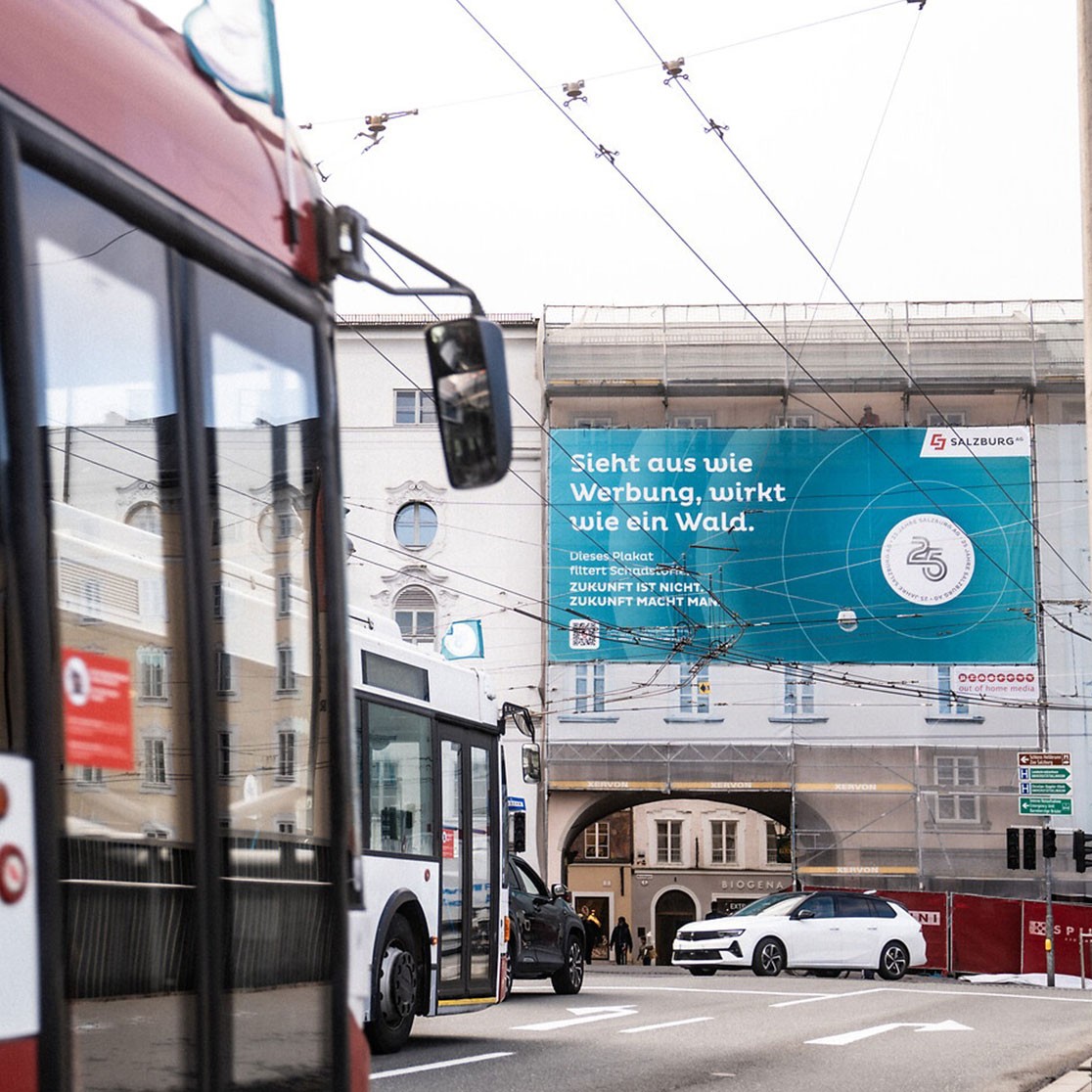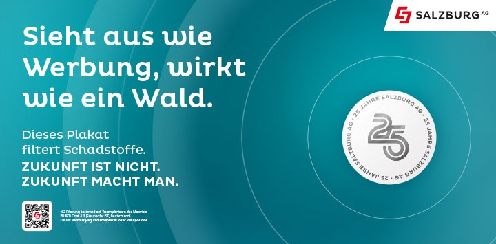 Für diese Pionierarbeit wird die Staatsbrücke ab sofort zur großen Bühne. Doch hinter dem neuen Werbeplakat zum Jubiläum steckt weit mehr: Zum ersten Mal kommt in Salzburg ein Plakat mit schadstofffilternder Technologie zum Einsatz – eine zukunftsweisende Lösung, die gelebte Nachhaltigkeit nicht nur symbolisiert, sondern tatsächlich einen wertvollen Beitrag für ein besseres Morgen liefert.