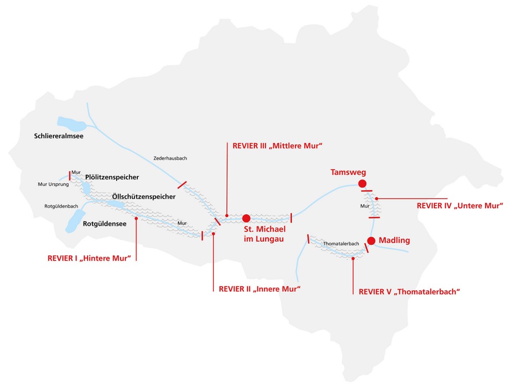 Besonderheit: Im oberen Teil der Mur ist es eine Hochgebirgsflussfischerei. Dieses Revier kann nur von Nächtigungsgästen aus dem Lungau genutzt werden.